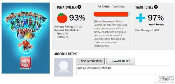 目前《无敌破坏王2:大闹互联网》口碑正式解禁,烂番茄新鲜度达到93%,平均分数7.4,电影将于11月23日在全国上映。