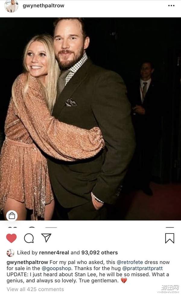 另外一位漫威电影宇宙的演员格温妮丝·帕特洛同样删除了一条INS。她先是发布了一张和星爵克里斯·帕拉特的合照,分享了自己的衣服,告诉大家这可以在她的店里买到,之后在同一条INS中,格温妮丝进行了更新,表示自己刚听到了斯坦李去世的消息:他会被深深怀念,他是个天才,永远那么可爱,真正的绅士,