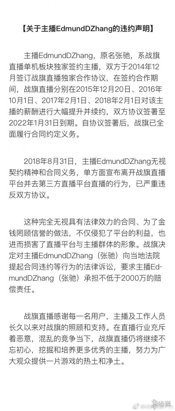 在8月底,战旗TV曾通过官方微博发布过一则违约声明,声明称“主播EdmundDZhang无视契约精神和合同义务,单方面宣布离开战旗直播平台并去第三方直播平台直播的行为,已严重违反双方协议”,并要求其“承担不低于2000万的赔偿责任”。