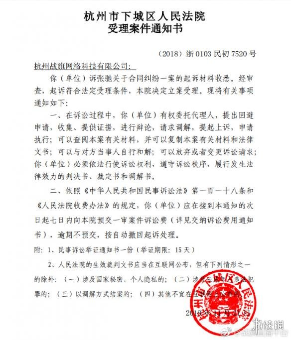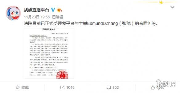 今日,战旗直播平台官方微博发布公告,表示杭州市下城区人民法院目前已正式受理战旗直播平台与主播EdmundDZhang(张驰)的合同纠纷。