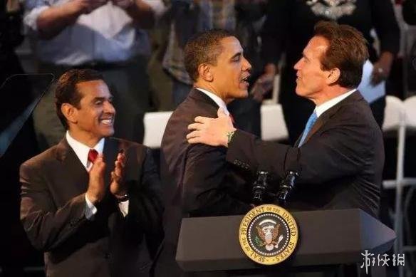 2009年,美国总统奥巴马和施瓦辛格在加州市政厅握手拥抱。