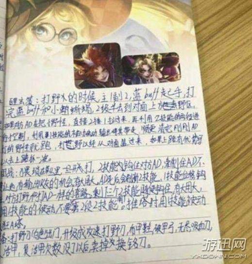 看这位小学生的做的笔记还真是非常认真的,首先是写上一个大大的标题,接下来就一步一步的分析英雄的出装,大概需要花多少钱,买什么样的装备,先打什么野怪赚钱,当遇到敌人的时候先放什么技能,“如果敌人没死,别让他逃,放2技能,若他进塔自己就回城加血。”每一个步骤都写得一清二楚,小编真是佩服!
