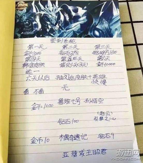 不过这位小学生并不是分析英雄的打法,而是记录下游戏系统签到会奖励什么东西之类的,还有一些英雄皮肤的价格等,这位小学生是打算存下钱来买英雄和皮肤,看来这位小学生还真是有商业头脑啊,这么小就开始会赚钱买英雄和皮肤了。