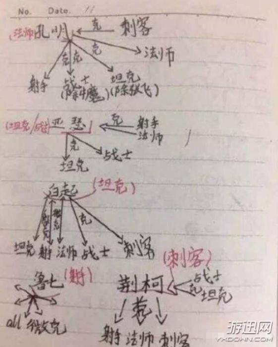 小学生的第二页笔记是英雄的定位,比如这个孔明,孔明这个英雄能克刺客、法师、射手、坦克(除张飞)、战士(除牛魔),看来这位小学生玩孔明真是非常厉害啊。估计当时在游戏中遇到了张飞,张飞开大怎么打都打不掉血,估计被虐怕了吧。除了这些之外,还有亚瑟、白起、阿珂、鲁班,这几个英雄都是小学生们经常会使用的英雄。对每一个英雄攻略都了解的一清二楚,看来这位小学生的英雄池还挺深的呢!