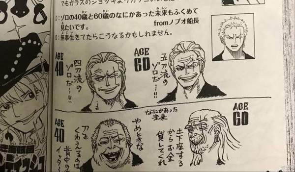 目前《海贼王》漫画单行本91卷已经发售,在本次单行本中尾田荣一郎又透露了不少漫画中角色的“秘密”,其中最受人瞩目的便是索隆的40岁和60岁形象,同样有正常版和跑偏版。正常版中,索隆是越来越强,每过10年就增加一把刀的使用,到60岁时就能变成五刀流,额这要怎么拿...