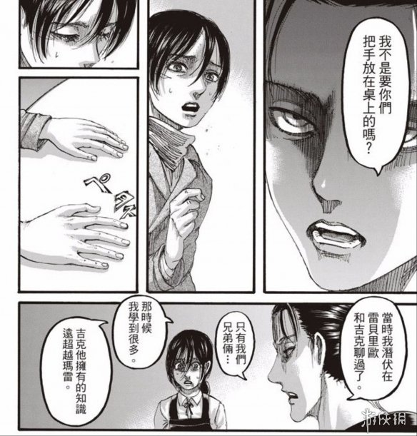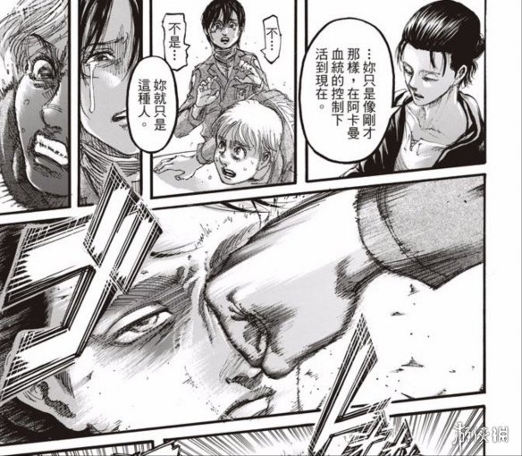 艾伦表示三笠现在的行为就是阿卡曼的血统在控制她,三笠泪流满面却无法反驳。艾伦要带着他们去找吉克,果然和吉克见面就是艾伦的目的。