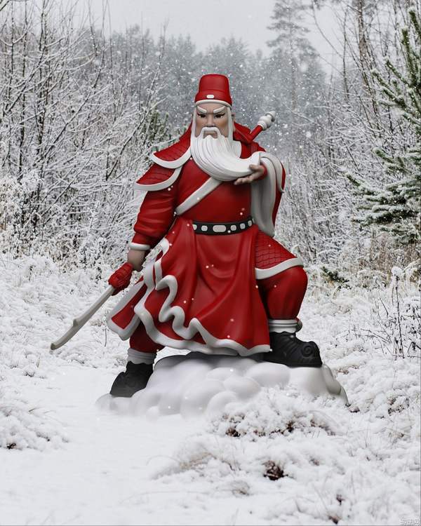 圣诞关公右手握着招牌武器青龙偃月刀,左手托着长长的胡须,以红白两色为主题,细节刻画十分精美。铠甲上的鱼鳞的纹路、展现长袍的飞扬的服装褶皱,还有偃月刀柄的雕纹等等都非常细致。手办底部采用云朵状的造型,让人感觉这位圣诞关公是踏云而来。
