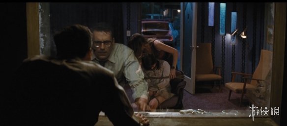 嬉皮士女这么一枪打下去,把双面镜轰出一个洞,嬉皮士女发现了背后的暗室,还顺手抓了一个酒店服务生。