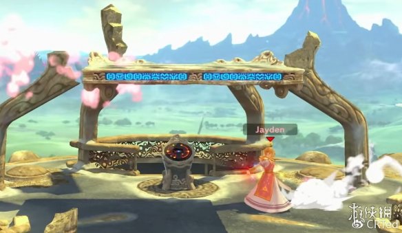 而转动“初始之塔”的视角,我们甚至可以非常清楚的看到远处的初始台地和双子山等“荒野之息”中的地标建筑。而破坏中间的穹顶后,站台上的神秘符号用“荒野之息”中的文字翻译过来就是“Super Smash Bros”。