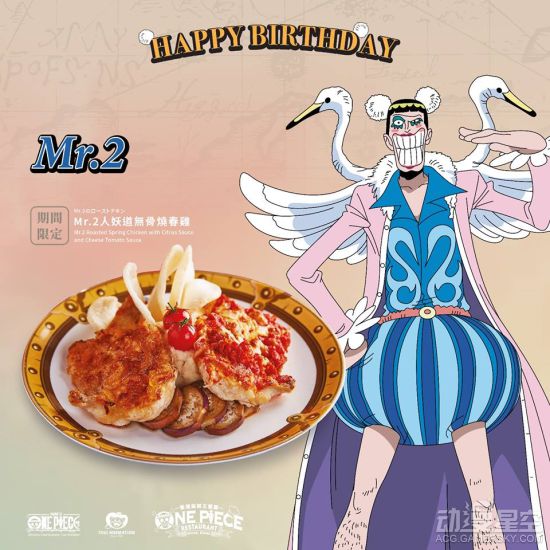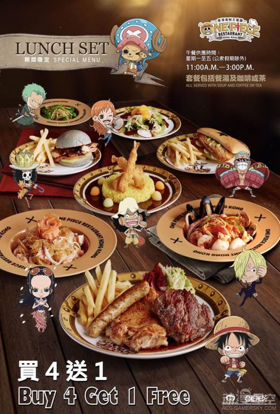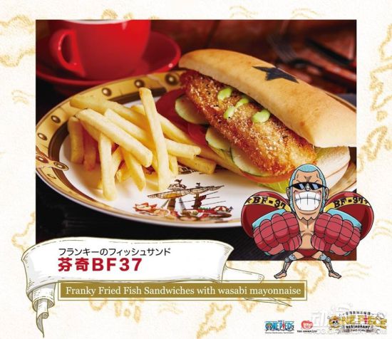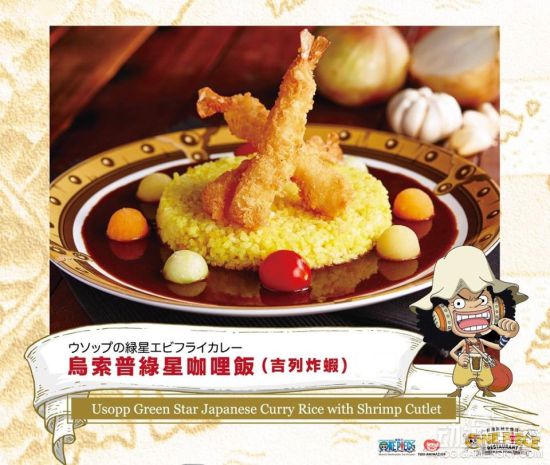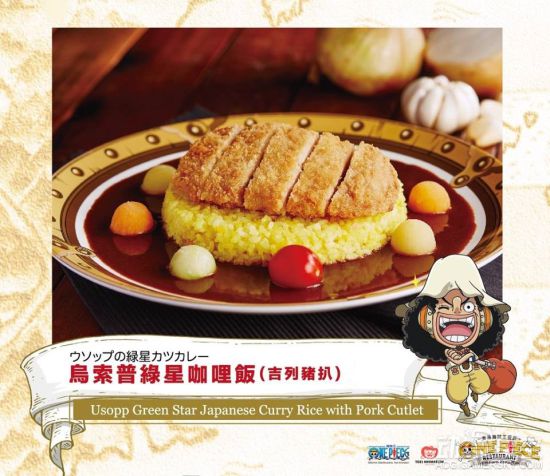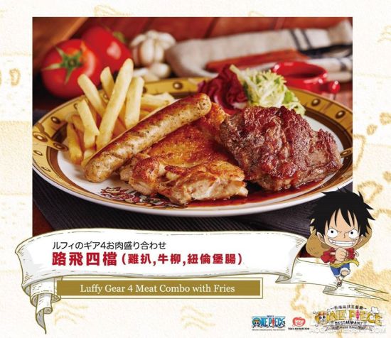 主角名称或以技能命名的主题餐点必定不会少,草帽一伙谁也没拉下。还有大奖赤犬、青雉等,王下七武海汉库克等等。