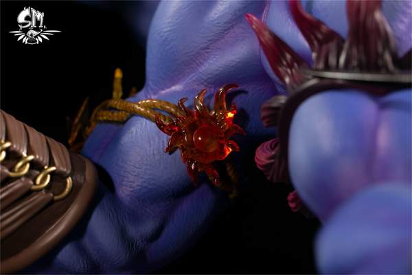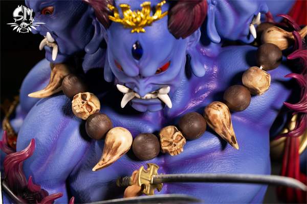 鬼气九刀流是用杀气把自身变成“三头六臂”之鬼神的形象,并且快速的是超越人体极限的招数。这款雕像也是将这个招数的跃动感很好的展现出来,感觉索隆马上就冲过来放大招了。雕像中的索隆和背后的鬼气都采用了三头六臂的形象,这样的索隆一共持有九把刀,但是在雕像中,每把刀展现的都是错落有致,给人强烈的空间感。三头六臂的索隆,搭配紫色鬼气地台和恶鬼的形象给人十分炫酷的感觉。