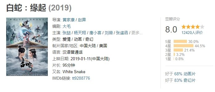 目前《白蛇:缘起》在豆瓣上的评分为8.0,口碑相当不俗,电影上映三天票房已超过3500万,连续两日排在内地票房榜第三的位置。