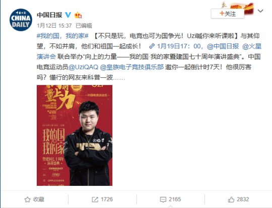 前几天小弟就预告过RNG选手UZI将参加建国七十周年演讲盛典,官博在19号曝光了UZI的部分演讲内容。