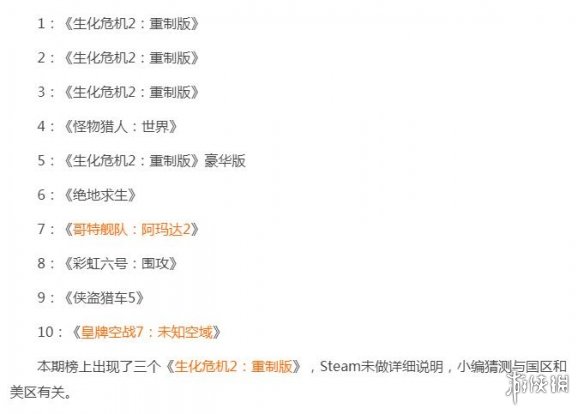 不是生化危机一口气占了四个名额,而是GTA5在被占掉四个名额之后,居然还是在榜上...