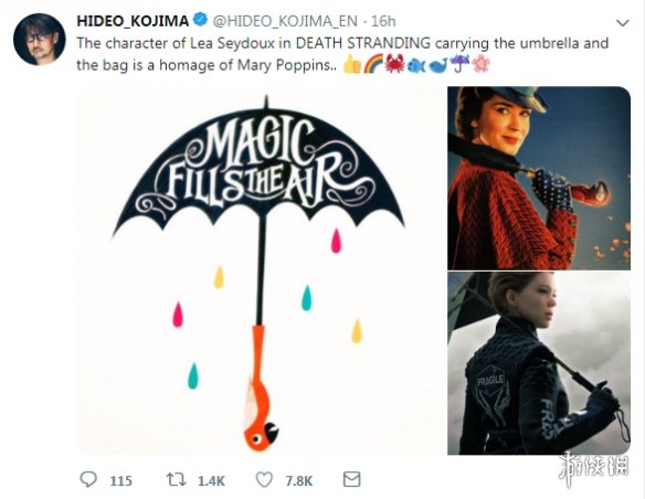 之前已经公开的预告中,由雷雅·赛杜饰演的角色出场就是撑伞的状态,最近电影《新欢乐满人间》在日本上映,小岛秀夫在看电影的同时还爆料,雷雅·赛杜饰演的角色的设计的灵感来源:预告中雷雅·赛杜撑伞携包的造型,是为了致敬电影《欢乐满人间》。