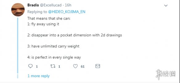 “这也意味着她(雷雅·赛杜)可以:1、撑伞飞走。 2、隐遁进一个2D风的口袋空间里。 3、能携带无限重量的东西。 4、在每个方面都很完美。”