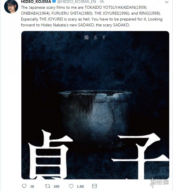 游戏制作人也是有个人生活的嘛,虽然小岛秀夫看起来一点都没有在做游戏的样子233333。然后他今天又来推荐电影了,这次是98年原版《午夜凶铃》的导演中田秀夫的最新力作——《贞子》,除了安利《贞子》之外,小岛还推荐了他最喜欢的5部日本恐怖片,《午夜凶铃》当然也在其中,但是小岛秀夫却强烈推荐了另外一部电影。