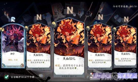 那么既然是《阴阳师》衍生的卡牌类游戏,那么游戏中没有抽卡系统就说不过去了。目前在游戏中式神是固定存在的只有11个,除了新手送的式神被激活状态之外都处于未激活状态。抽卡只是抽取每个式神的技能,每个技能有着自己从N、R、SR、SSR的稀有度评价。
