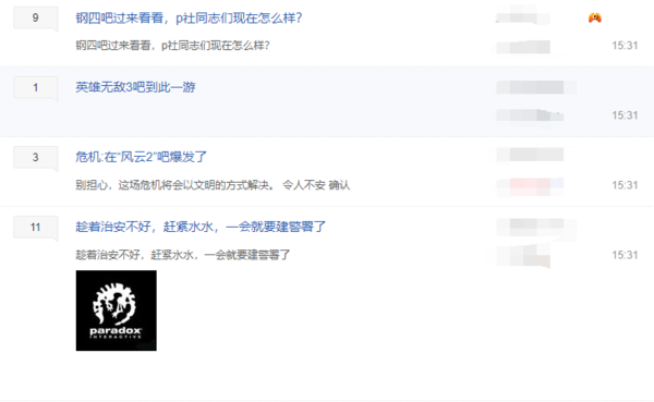 于是,“风云2”吧的“土著”们在讨论天霜拳、排云掌、风神腿哪个更强的时候,深谋远虑、处变不惊的P社玩家们正在为罗马欢呼。而由于“风云2”吧原本就活动人数稀少,首页瞬间就被蜂拥而入的P社玩家占领,整个贴吧顿时陷入混乱。加上“钢铁雄心”吧、“英雄无敌”吧等闻讯前来参观的吧友一搅和,乱成了一锅粥。
