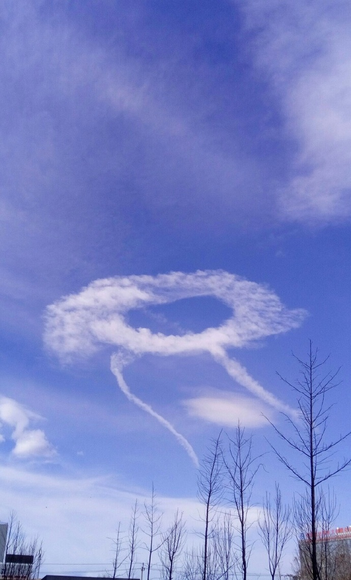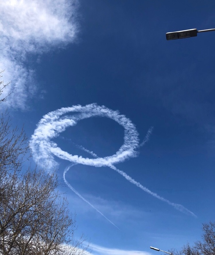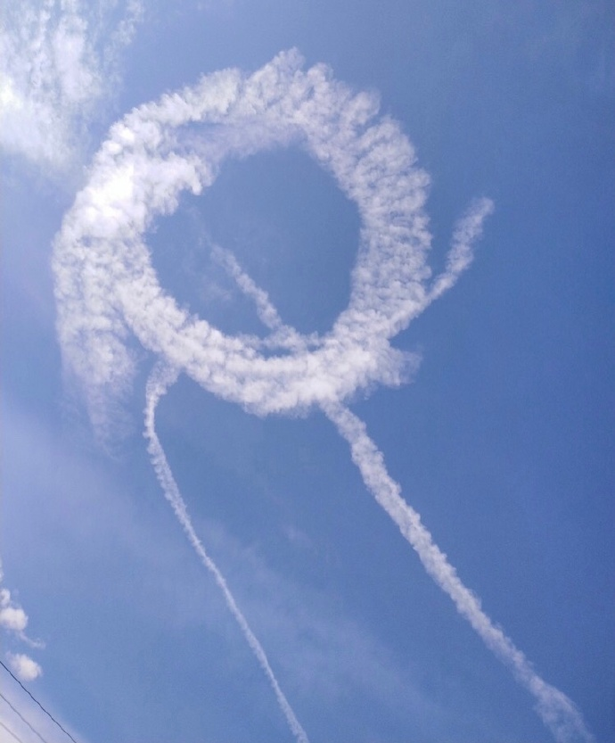 据说,这个神奇的云圈是由于西郊机场区域管制,飞机眼瞅着在天上绕圈,部分照片中的“两根触手”是飞机进出的痕迹,像个天上的小怪物!