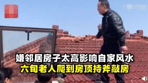 3月11日,安徽滁州,一对六旬夫妻爬上邻居家楼顶,原来邻居家房子比自家高10几厘米,两人认为影响风水,便用斧头拆掉部分建筑,与房主争执后又表示要跳房。经民警劝说,老人放弃轻生念头,目前两家已协商处理此事。