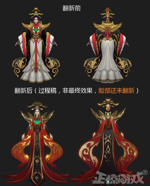 关于模型的优化,这次官方爆料出来的英雄为芈月的“大秦宣太后”。自这次的优化中,将芈月的整个模型进行了一系列改变,其中就有服装配饰,显得更加雍容华贵。而且特效方面火凤凰元素将会更加细致。