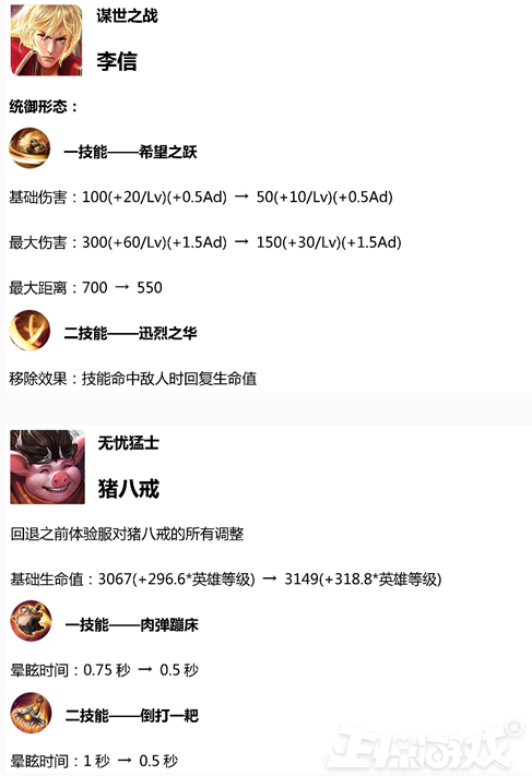 小乔的二技能CD总体增加,但前期加强。李信的统御形态下,一技能的伤害和距离都减少,二技能回复生命值效果移除。猪八戒的基础生命值增加,但是一二技能的眩晕时间都大幅减少。