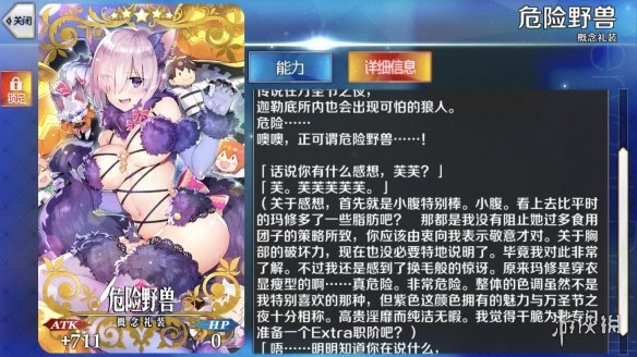 (要问怎么样,首先肚皮很棒。肚皮。不是比平时的玛修增加了点多余的脂肪不是吗?你们应该打从心底对没制止她吃多团子的我机智的策略表示敬意。关于胸部的破坏力,那就是事到如今还有什么好说的,咯。我早已深刻领略到了。不过真的,有点惊讶到毛变色了。原来玛修穿衣显瘦……好危险。超危险。虽然整体上的色调和我的喜好略有偏离,但紫色这个色彩拥有的魅力和万圣之夜正相符。高贵而又淫荡却又纯洁。这已经该创造一个只属于她的额外职阶了吧?)