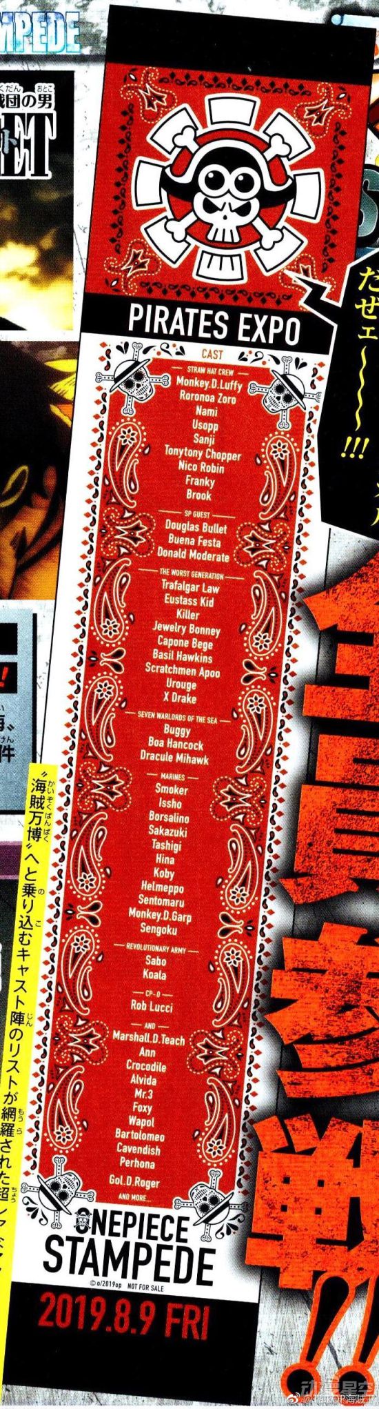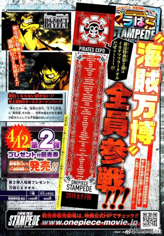 《海贼王》20周年剧场版《STAMPEDE》在近日公开了登场的角色阵容,这次的出场阵容相当华丽,草帽一伙、海军、七武海、天龙人政府、革命军等都会登场亮相,再加上新角色,可以说是人气角色全员出场了。最新的官方杂志图也用了“海贼万博,全员参战!”这样的宣传语,看来这次大家的一大乐趣就是来找角色了。
