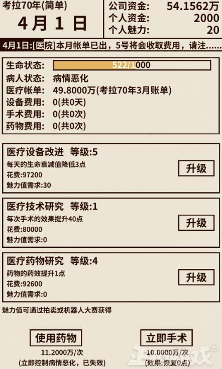 你需要不停的花钱去给老爸升级医疗设施、吃药、做手术,健康值降到0就去世了↑