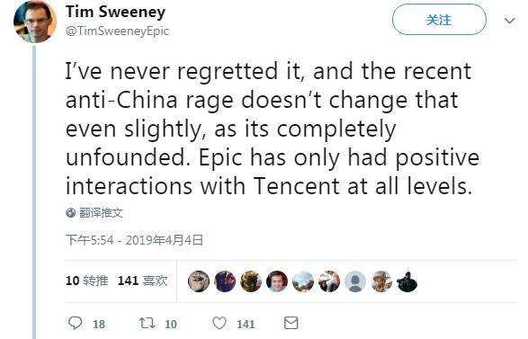 随后Sweeney连发数条推特,称从1991年开始,Epic Games就是完全由自己控制的,而且他们拥有许多不同的投资者,腾讯是最大的一个,但无论是哪个投资者都无法获取Epic消费者的信息。同时Sweeney表示从未后悔过与腾讯的合作,舆论对于中国的不满情绪完全没有改变过自己的想法。
