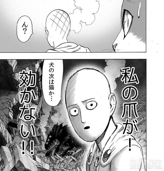埼玉老师一拳揍飞波奇的场面被怪人喵喵看到,虽然觉得埼玉相当厉害,但是喵喵还是想要偷袭他。喵喵的利爪对埼玉造成了类似小猫咪的抓伤,但是完全没有什么伤害力,见势不妙的怪人赶紧逃跑了。
