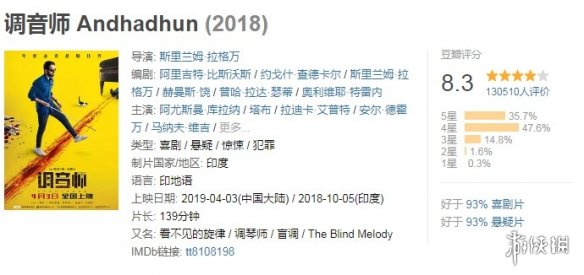 《调音师》在豆瓣电影中也给出了8.3的评分,口碑不错,该片已于4月3日在内地上映,喜欢悬疑犯罪类的朋友不要错过这部优秀的印度电影。
