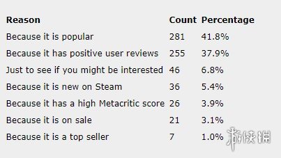 根据该开发者的统计,绝大多数的游戏获得推荐是因为游戏的流行(占比41.8%)和用户好评率较高(占比37.9%),可能感兴趣的推荐位占比6.8%、新游戏推荐位占比5.4%、Metacritic评分高的占比3.9%,促销的占比3.1%,位于畅销榜拿到推荐的占比只有1%。