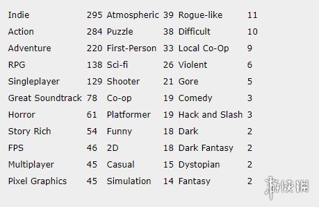 热门标签:在被统计的游戏当中,独立游戏是使用率最高的,达到了295款,其余四个使用率超过100次的标签是动作(284)、冒险(220)、RPG(138)和单机游戏(129)。
