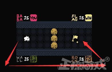 如下图所示,图中有“Baba是你(Baba Is You)”“墙是停(Wall Is Stop)”“旗子是赢(Flag Is Win)”“石头是推(Rock Is Push)”四个句子,这代表你将控制这条叫Baba的小白狗,遇到墙就必须停下,遇到石头可以去推,走到旗子上才能赢。这是新手教学关,所以你可以控制Baba直接走到旗子上,就算过关了。