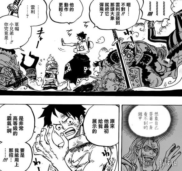 路飞和豹五郎正在与犰狳SMILE能力者的犰狳人战斗。路飞看起来似乎没在攻击,但是他是想使用像雷利和战桃丸那样不用触摸也能将敌人打飞的攻击,这样的话似乎连凯多的鳞片也能打碎了。