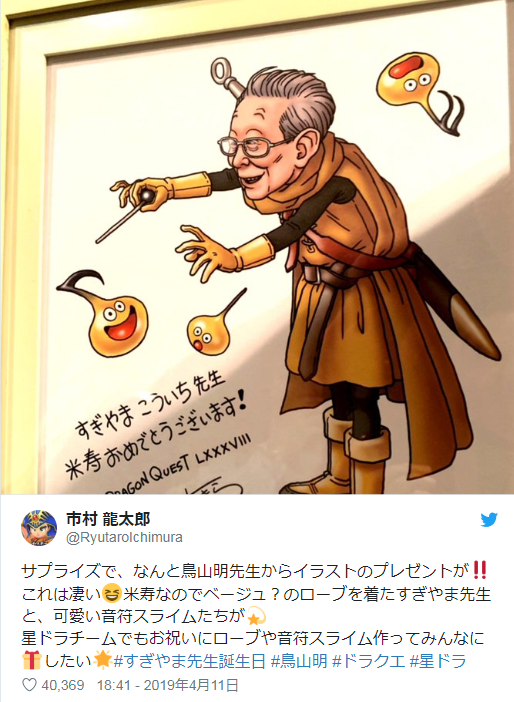 椙山浩一是《勇者斗恶龙》系列游戏的御用作曲家,也是日本著名作曲家。日前这位大神迎来了88岁的生日,作为《勇者斗恶龙》系列的御用角色设定师鸟山明则献上了一份特别的礼物——亲绘的史莱姆插画祝贺。