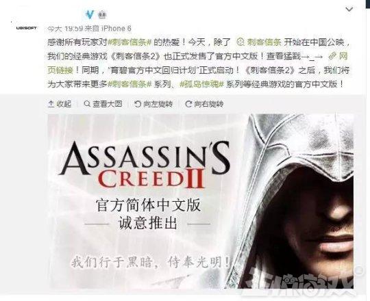 从2017年开始,育碧陆续将自家产品增加简体中文。先是增加《刺客信条2》中文语言包,同时宣布启动“官方中文回归计划”将旗下所有游戏系列全部推出官方简体中文!在2018年CJ展上育碧CEO亲口承认以后育碧所有游戏均会支持简体中文