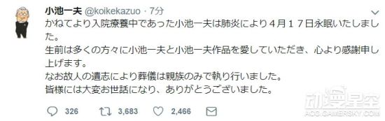 根据官方推特消息,日本漫画原作者、小说家、剧作家小池一夫因肺炎于4月17日辞世,享年82岁。小池一夫曾参与《骷髅13》的早期创作,还担当了《哭泣杀神》、《带子狼》、《御用牙》、《修罗雪姬》等作品的原作。