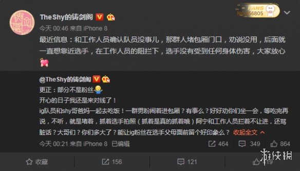 随后,iG上单“Theshy”的应援站负责人发布微博简述了事情的经过,iG队员“Theshy”和爸妈还有其他队员一起吃饭,突然由一群男粉闹着要进包厢,iG这边劝他们等一下,吃完饭再合影,但是他们不仅不听还抓着选手要求合影。
