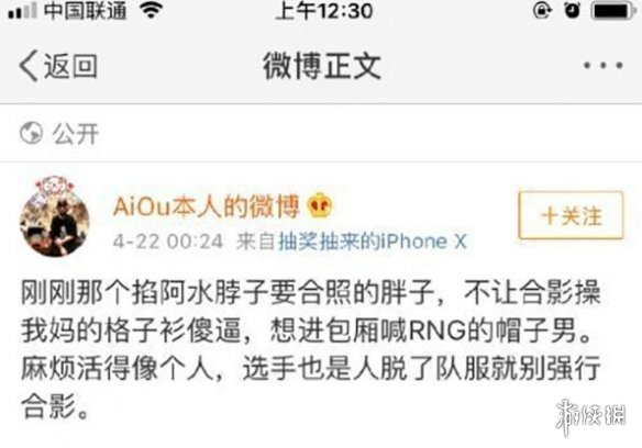 iG著名“非”工作人员A总最先在微博上爆出这件事。微博原文:“刚刚那个掐着阿水脖子要合照的胖子,不让合照*我妈的傻逼,想进包厢喊RNG的帽子男。麻烦活的像个人,选手也是人脱了队服就别强行合影。”