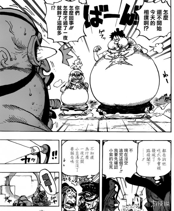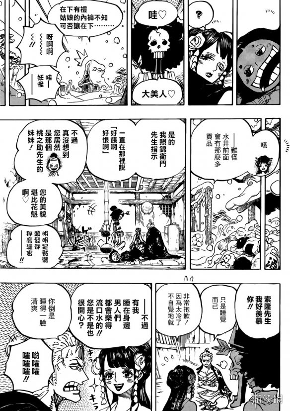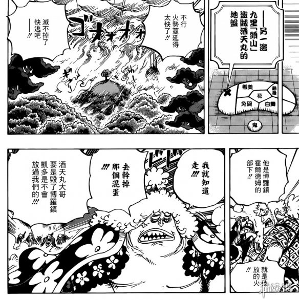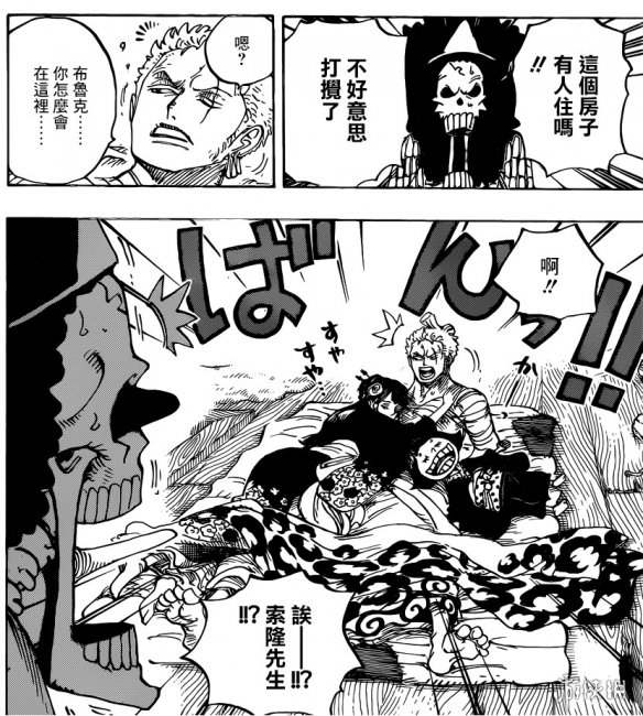 在另一边,酒天丸所藏匿的山林被霍尔德姆的部下放火烧掉,酒天丸打算去报仇。锦卫门听说之后带人前去阻拦,一定要让酒天丸加入他们。布洛克在北方的小房子里面遇到了索隆和小紫他们,小紫竟然和索隆睡在一起!大家互相介绍之后,布鲁克告诉他们丑三小子被抓了。
