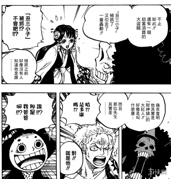 丑三小子是财神镇的那个大红人多康,这人的身份让索隆大吃一惊。而且他还是小南子的爸爸,小南子在听到消息之后立刻冲了出去,小紫和索隆、布鲁克也紧随其后。然而财神镇的大红人多康的真实身份是光月家的一位领主,身份相当显赫,难怪大蛇要亲自观看他被公开处刑。感觉之后花之都又要热闹了。