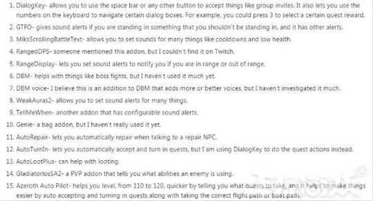 BlindlyPlayingGames的方法就是使用插件,各种插件简化游戏的操作同时实现语音播报关键信息,例如DBM、TellMeWhen(设置语音警报),GTFO(错误站位语音警报),以及一些帮助阅读任务和窗口信息等插件,此外他还使用了大量的宏命令来辅助操作。