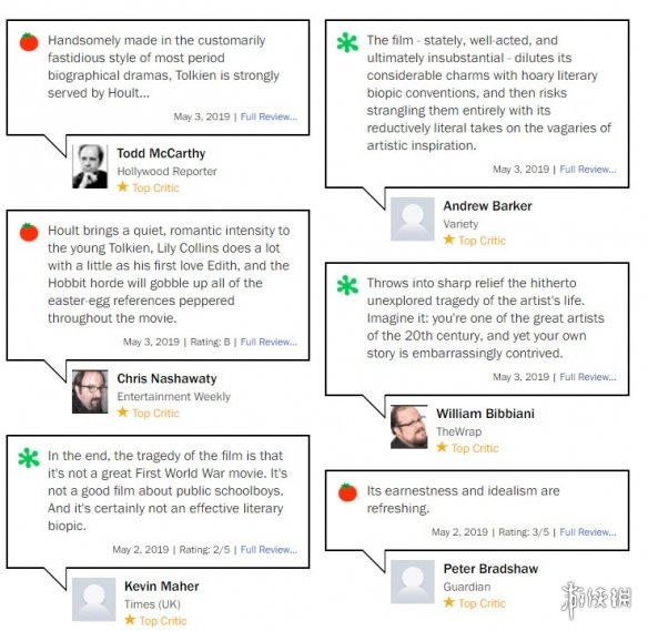 而Variety则给了本片“烂”评,评测者认为尽管《托尔金》格调庄严、演员表现良好,但本片最终还是太过单薄——古老的文学传记式套路让影片失色不少。The Wrap的评测者同样打出了“烂”评,评测者讥讽《托尔金》将一位“20世纪伟大艺术家”的故事讲得矫揉造作,令人尴尬。