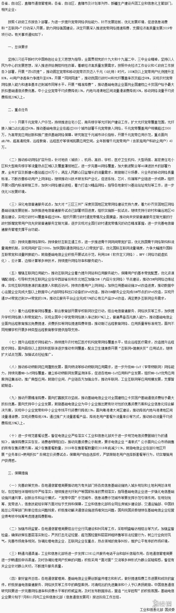 今日(5月8日),工业和信息化部、国资委发布了关于开展深入推进宽带网络提速降费,支撑经济高质量发展2019专项行动的通知,在通知中明确提出要开展“精准降费”,移动网络流量平均资费要降低20%以上。