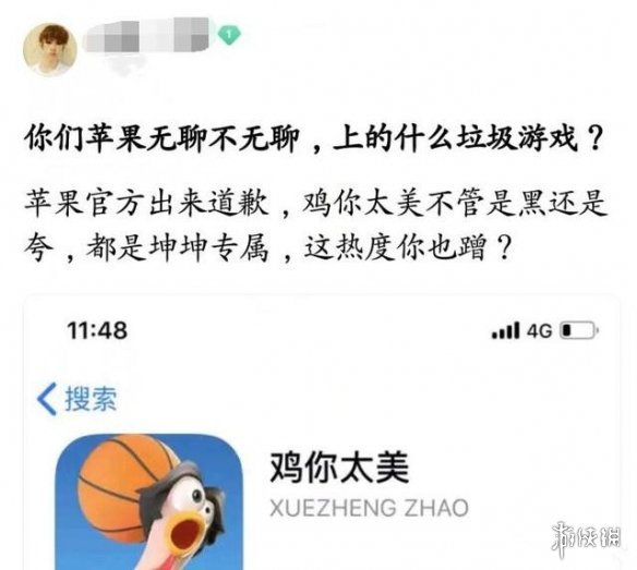ikun拿着游戏截图来到苹果贴吧,直接开始了对苹果的质问,不仅妄想要苹果官方道歉并下架游戏,还与苹果论坛的用户展开了激烈对峙,试图用这样的方式为自己的偶像讨回公道。