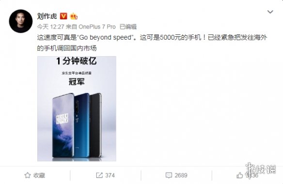 刘作虎称,“这速度可真是'Go beyond speed'。这可是5000元的手机!已经紧急把发往海外的手机调回国内市场 ”。