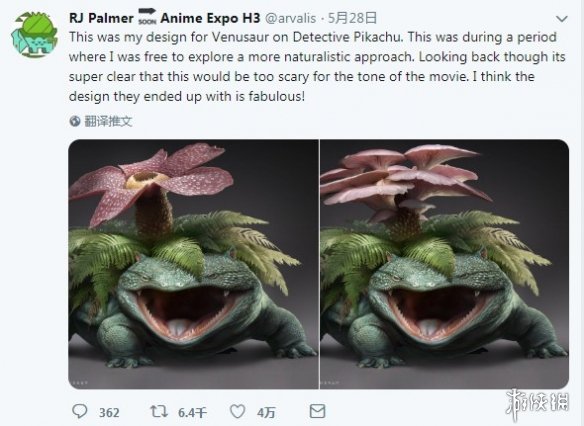 此前公布了《大侦探皮卡丘》里皮卡丘设计稿的设计师RJ Palmer又公布了妙蛙花的设计稿,在设计这一造型时,他还处于一个可以自由探索写实风格的状态。因此设计出来的妙蛙花有着怪龙一般的五官,张开着血盆大口,一排锋利的牙齿让他看起来像食人的异形而非一个宝可梦。